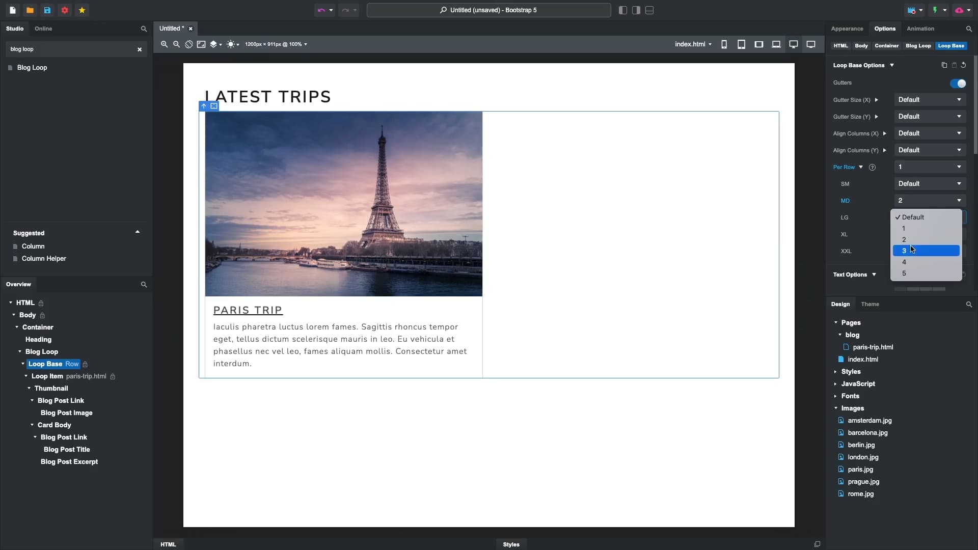 Since Blog Loop inherits all the options of Row, we can customize the layout by adjusting the number of posts per row using Bootstrap’s row and column settings.